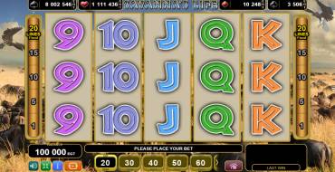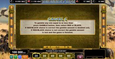 The playing field of Savanna`s Life online pokie has a 5x3 format. The provider offers people to bet on 1, 5, 10, 15 or 20 paylines. The minimum amount is 0.01 euros. Maximum bet in the game is 1000 euros. The scheme of making combinations is standard - from left to right from the first reel in a row for 3-5 identical symbols. In the game are 5 senior and 6 senior symbols. There are also special symbols, free spins, jackpots and a round to double the winnings. The biggest win a user can get at a time in the machine is x5000 of the bet.