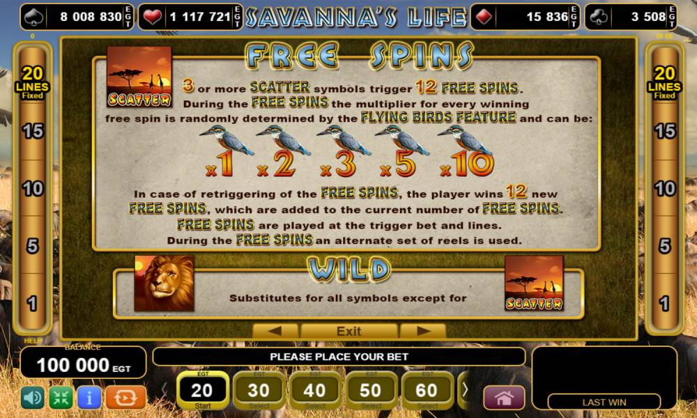 According to the Casinoz editorial team, Savanna`s Life is suitable for those who don`t want to be driven. It's good for a long game because it's high variance. Prizes pokie gives out large, but makes players wait. Therefore, to rip off a solid score, you will have to stock up on money and patience.