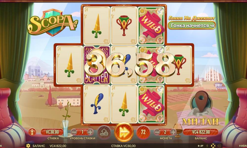 The bonus mechanics in the Scopa depend on the location, and where the player is at the moment. New places on the map are opened with the help of free spins, in the future the city will remain available on an ongoing basis and you can return to it.