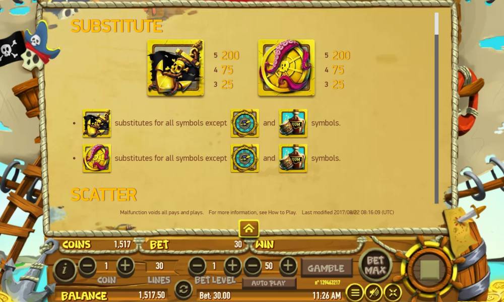If you are not indifferent to video slots about pirates, make sure you test this game. You gonna like funny characters, thematic bonuses, exciting free spins and features of special symbols. Please be aware of average levels of payback and dispersion choosing the bet and gaming strategy.