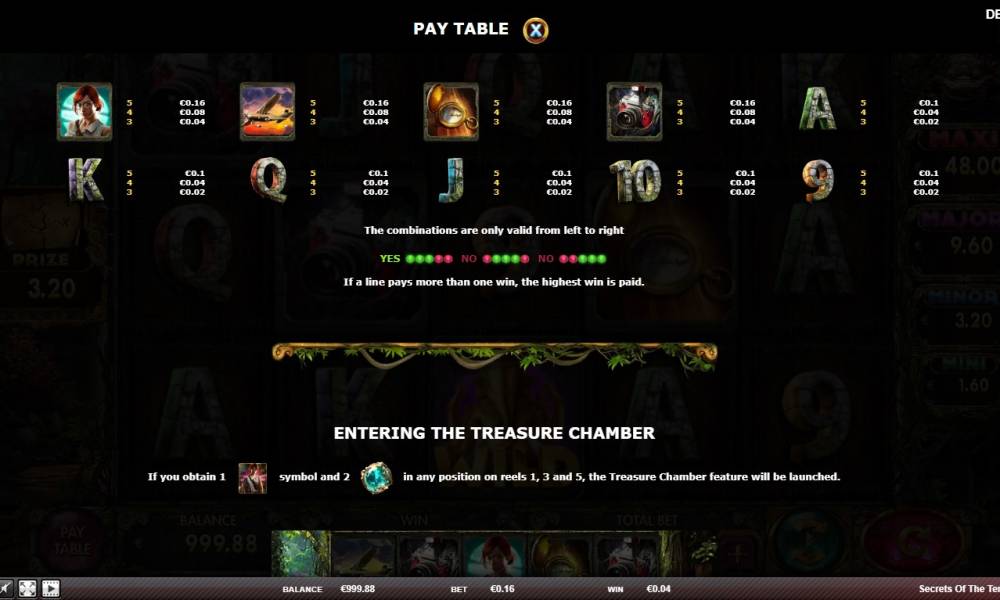 The Secrets of the Temple 2 features an atmospheric in style playing field with five reels in three rows. According to the developer, the slot features 243 ways to win. Simple symbols of varying value are the numbers 9, 10 and the letter designations of the senior cards of the deck, as well as a treasure hunter, an airplane, a camera and a compass. Winning combinations are possible only from left to right, and when several prizes fall on the line, the bigger winnings are paid out. The betting range is from 0.16 to 40 c.u.