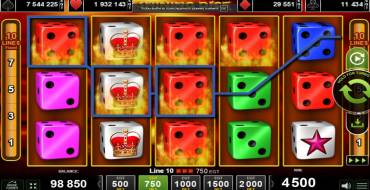 Wild symbol is the image of a crown on the die. Can substitute for all regular pictures except Scatter symbols. Stops on reels 2, 3 and 4 and, if it makes a prize combination, expands to the full reel.
