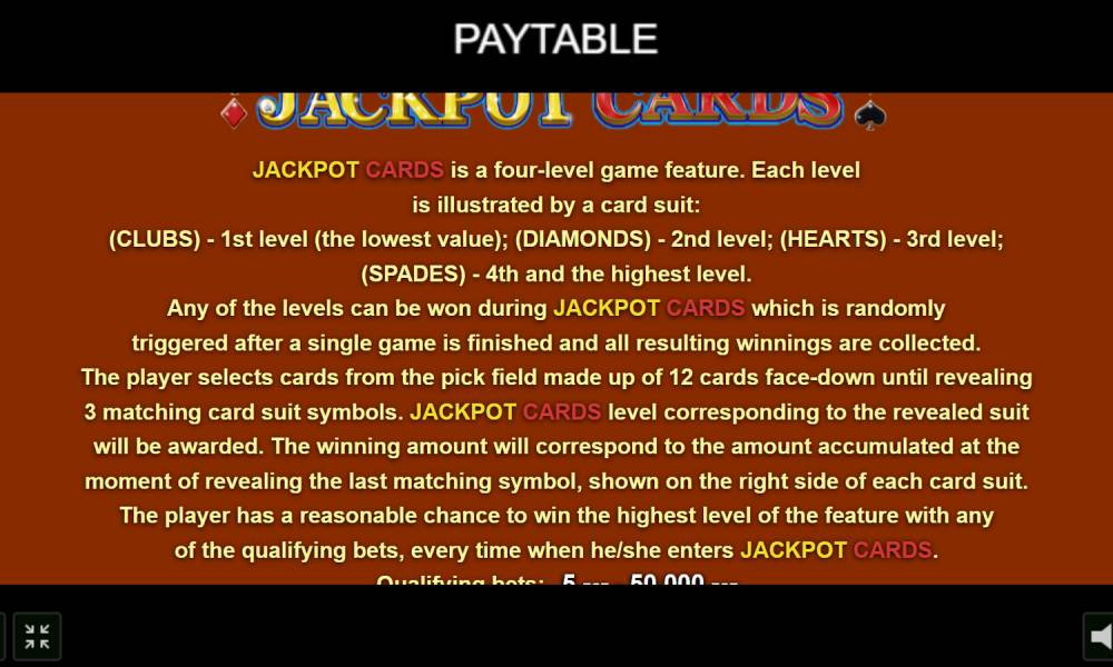 There are four jackpots in the Shining Dice online pokie. You can get one of them at a random moment when 12 cards appear on the field. They have to be turned over until three of the same cards are found. The suit of the card will correspond to the level and size of the jackpot. They are displayed at the top above the reels all the time, so the user can see what reward awaits them. Once obtained, the progressive jackpot resets to grow again.