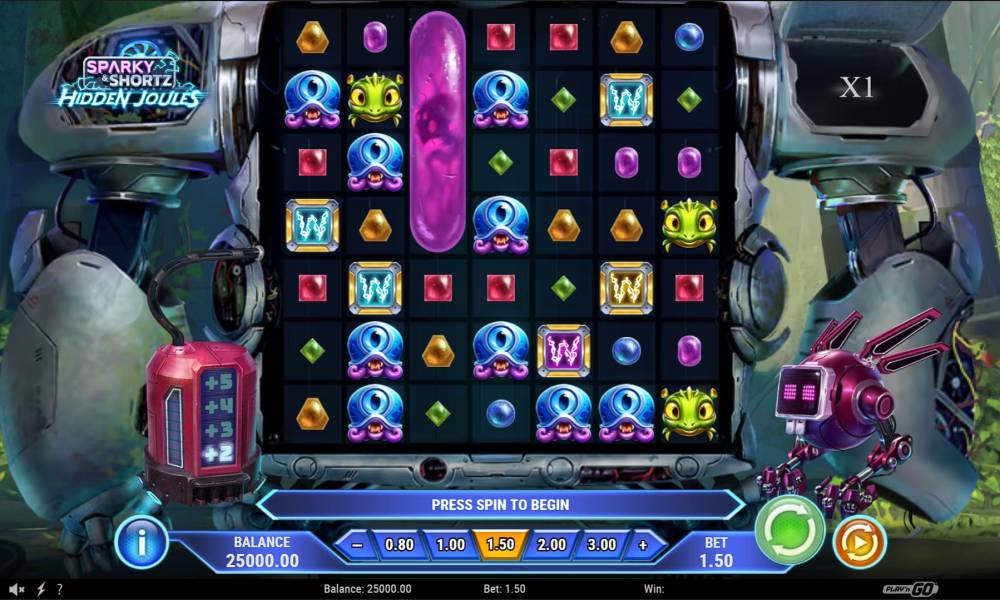 The playing field in Sparky and Shortz Hidden Joules is 7x7, there are no fixed paylines. A cluster scoring system is used from 5 symbols, or 4 if special conditions are met. Maximum winnings are limited to x6000 of the bet in a given round. The online pokie uses 8 regular and 1 special symbol, modified during bonuses. The standard bet from 0.1 to 100 cu.u. can be changed at the casino's discretion. Free spins are not implemented, but the cascading system fully compensates for this, giving out sometimes many combinations in just one spin.