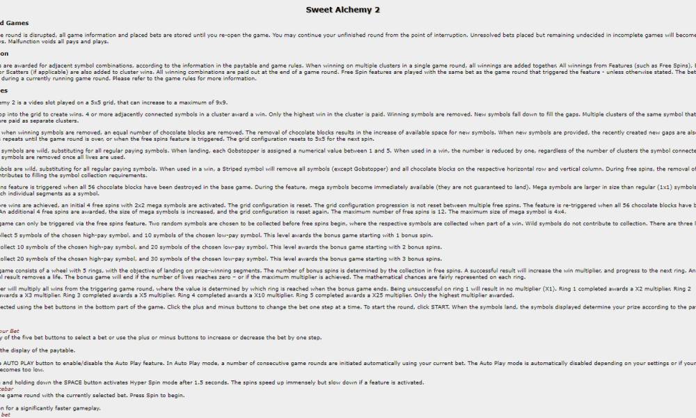 The demo version is a great way to familiarize yourself with the Sweet Alchemy 2 without the risk of losing money. It allows players to try all the features and bonuses of the pokie without investing real money. Playing the demo allows you to strategize, learn the mechanics and decide if this slot is right for you.