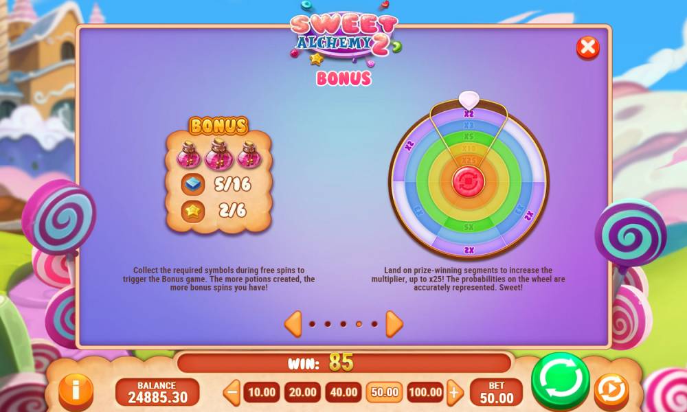 Sweet Alchemy 2 is an exciting pokie from Play'n GO that continues the story of Candy Witch, who returns with more magical treats and challenges for players. This slot with grid mechanics attracts with bright graphics and original gameplay, where every win is a step towards a sweet reward. The main goal is to clear the grid from candy clusters, using your magical abilities and activating unique features that make the gameplay even more exciting. The game is played on a 5x5 field and there are no familiar reels or paylines.