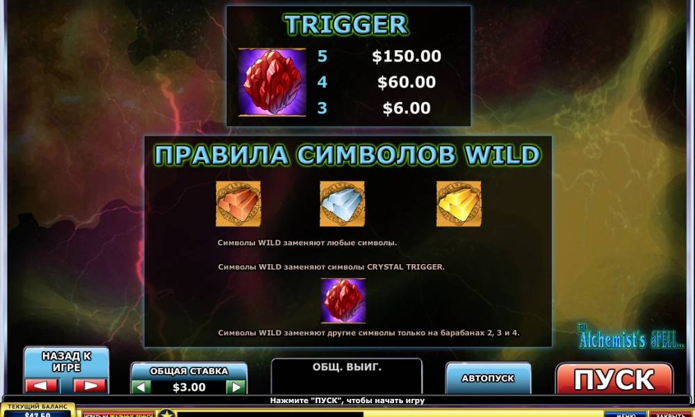 In the 5-reel video pokie The Alchemist's Spell, the pictures line up on the screen in three rows, and winning combinations are formed in 243 ways. There are no active lines here in the classic form. The goal of the game - to collect a combination consisting of several identical pictures, which are located on neighboring reels, starting from the first left.