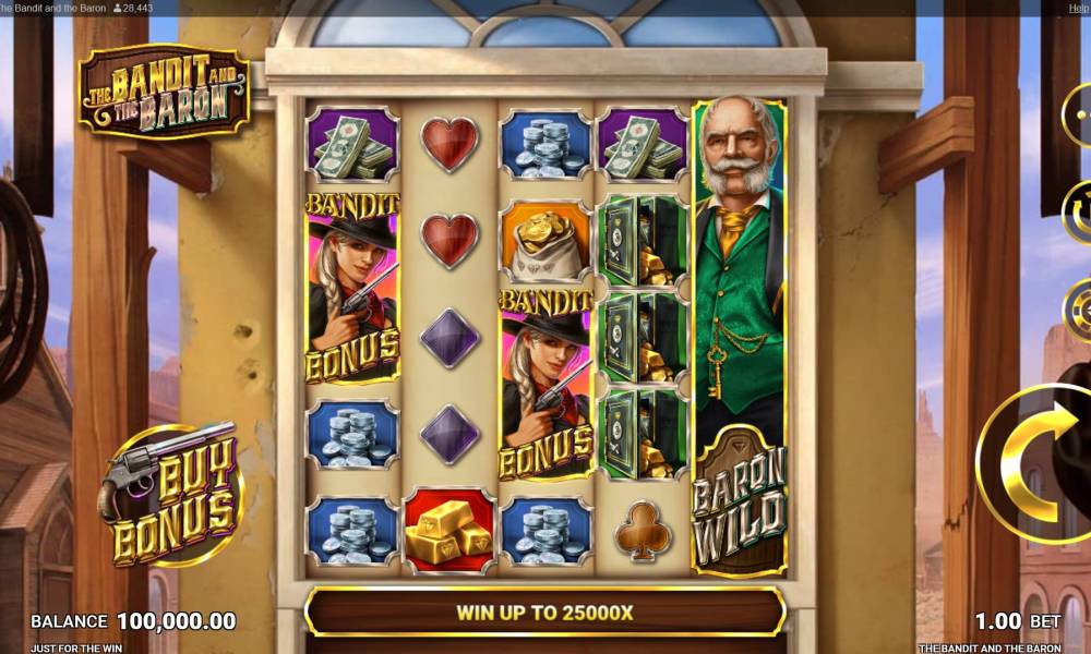 The Bandit and the Baron slot machine from the JFTW provider has a standard playing field, consisting of 5 reels with 5 symbols. Payouts are made on 25 lines.