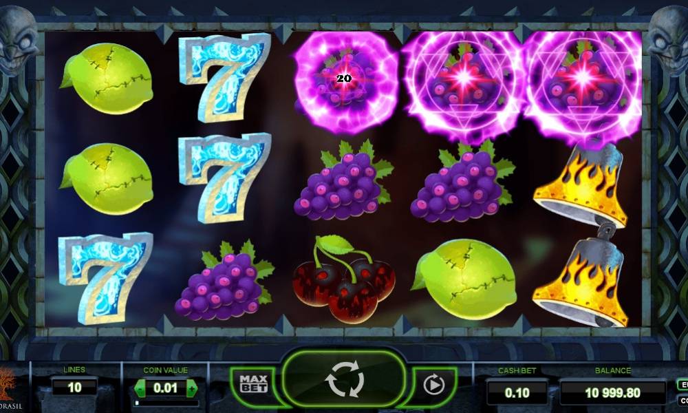 The gaming symbols, which you would see at the reels of The Dark Joker Rises video slot, are classic images, such as stars, sevens, bells grapes, lemons and cherries. Herewith, they are images in a ominous style corresponding tot he general theme. For example, lemons are sewed of pieces, while bloody-red skulls can be seen at the cherries. They appear in stacks and can fill not just the whole reel, but the whole screen as well. To form a combination, it is necessary to pick from three to five such elements.