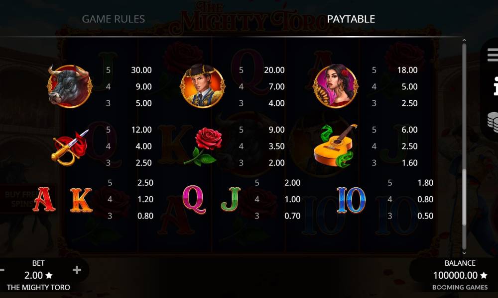 The Mighty Toro is dedicated to the most famous and old Spanish tradition: bullfighting. The pokie's design is appropriate: the playing field is set against the backdrop of a stadium with a bull and a bullfighter, and among the symbols you'll find the usual attributes - a guitar, a sword and a rose. The Mighty Toro is developed by Booming Games and will be released in early 2023. In terms of mechanics to surprise the player he has nothing: a small field, free spins, a couple of bonus features and parameters at the level of average. However, you won't be disappointed either: the slot is beautiful, and the bonuses are balanced and pop up frequently.