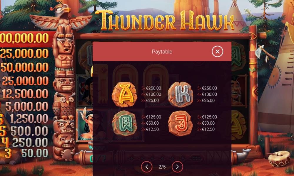 The Thunder Hawk is a pokie with a 5x3 field and 20 win lines. In order to form a combination, you need to collect identical symbols from left to right. The betting range varies from 4 to 10,000 coins per spin. The maximum winnings reach 10,000x the bet. The game has risk game that allows you to increase your winnings. The main elements of the game: symbols, bonuses, free spins.
