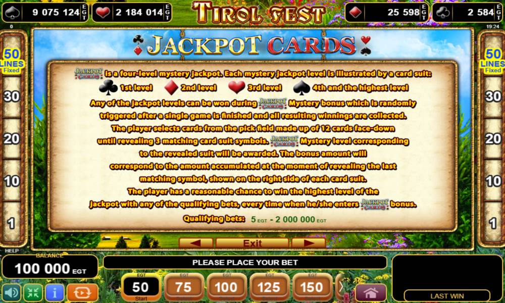 Anyone can bust one of the progressive jackpots. Jackpot Cards round is activated independently. Among the fallen 12 cards, the player must find three identical cards. The size of the jackpot corresponds to the suit and is displayed above the reels all the time.