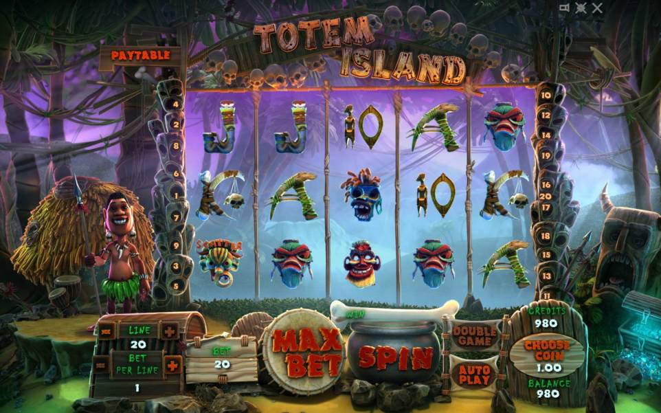 «Totem Island» is a free online slot machine with five reels, twenty pay lines and three rows of symbols at the screen. It is possible to activate one, three, five, nine, fifteen or twenty lines. The customer can stake up to forty coins in value of 0.01, 0.10, 1 or 10 credits per each of the lines. This way, it is possible to stake from one cent to eight thousand credits per spin. The bets per each of the lines are always the same.
