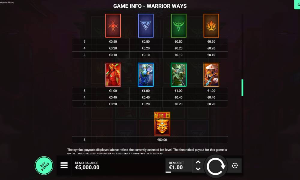 When you study the features of the slot and its functionality, you can start paying for real money and enjoy real winnings. The Warrior Ways slot machine is in different online casinos in the list below. All of them have licenses and guarantee an honest game. Before playing, look at the paytable, where there is a lot of information about the combination’s win.