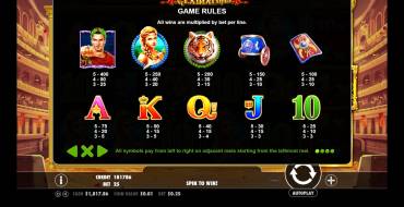 If you are already familiar with video slots of this developer, the interface won’t surprise you. The control panel is standard and provided with convenient and user-friendly elements. It is possible to select the bet at the floating panel. New rounds can be played in manual or automatic modes. The pay table is pretty informative and offers thematic tabs, visual schemes and animated demo videos. «Wild Gladiators» allows to set up the sound, size of the screen, speed of the gameplay and other options. You can play this slot in a browser on your laptop or on smartphones using mobile version.