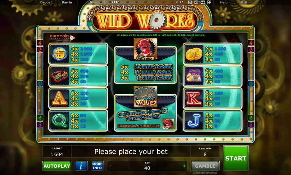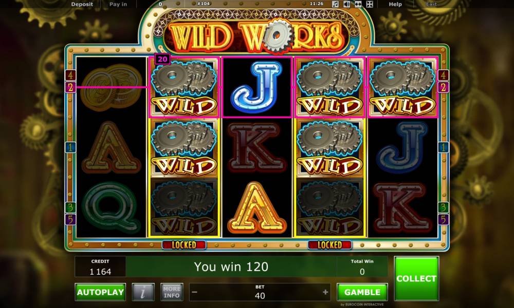 The Wild Works video pokie from Eurocoin (Novomatic) will appeal to fans of machinery. It introduces players to a cheerful robot that stamps gold coins. The model is interesting because of its favorable rules for forming combinations and additional gameplay features, which are described in the Casinoz Gambling Encyclopedia review.