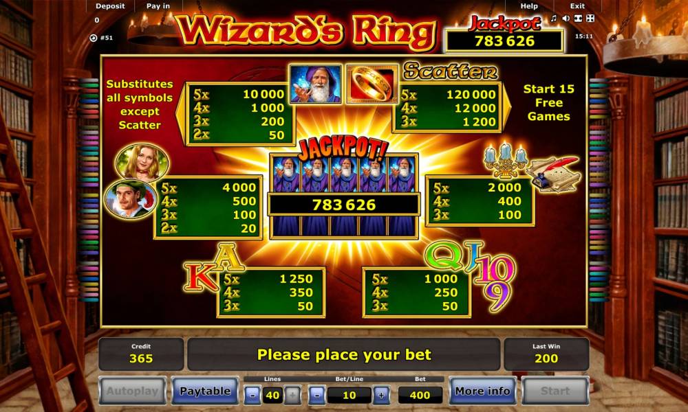 The fans of online gambling games in fantasy style are recommended to read a review of a new online slot machine «Wizard’s Ring», developed by Novomatic company. It is an impressive model about a great magician, which combines a stylish design with spectacular animation effects and exciting features. Please read the review, prepared by the authors of Casinoz and test the game directly in a browser.