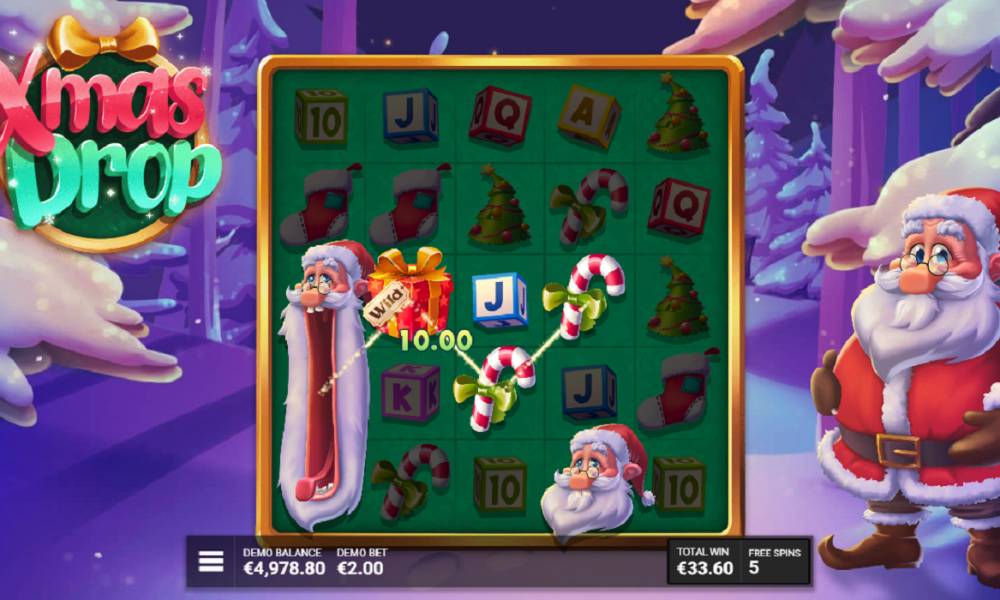 The Xmas Drop uses a standard 5x5 grid with 19 paylines. Christmas paraphernalia symbols such as Christmas socks, lollipops, Christmas trees, toys and bells can be found on the reels. In addition, there are 10-A card symbols in the form of beautiful children's cubes.