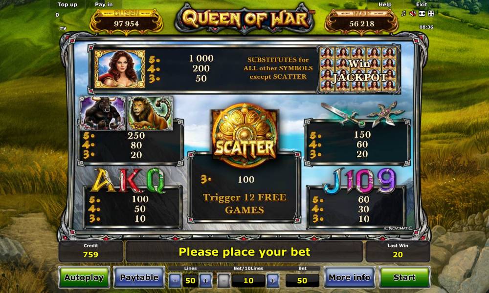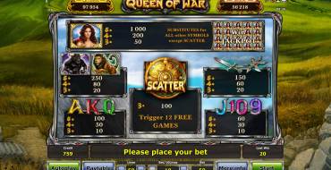 This video slot draws two progressive jackpots: Queen and War. The first one is drawn in the regular spins, while the second is available in free pins. Their amounts rise up due to the deductions of a small part of all bets placed by real money. To win the jackpot, you need to fill the whole screen with images of the main heroine. The whole amount goes to the lucky one playing by the maximal bet. If you reduce the bet, an amount of the potential jackpot goes down proportionally.